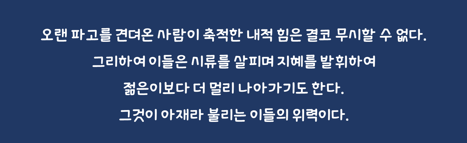 나이 든 사람이 팔을 걷어붙이고 일을 시작하면 주변에서는 모두 저러다가 말겠지! 라고 생각한다. 세월 앞에 장사 없다는 격언처럼 시간은 많은 것을 약화시키기 때문이다. 그러나 오랜 파고를 견뎌온 사람이 축적한 내적 힘은 결코 무시할 수 없다. 그리하여 이들은 시류를 살피며 지혜를 발휘하여 젊은이보다 더 멀리 나아가기도 한다. 그것이 아재(아저씨의 준말)라 불리는 이들의 위력이다.