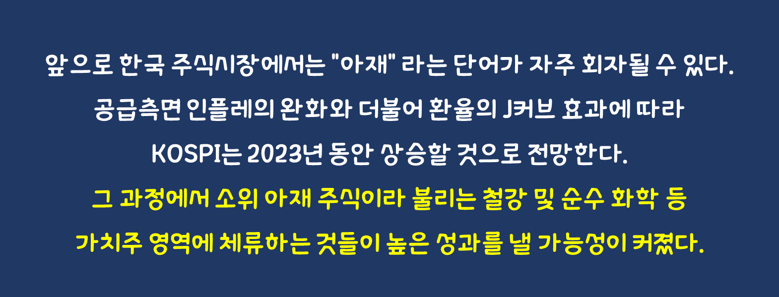 앞으로 한국 주식시장에서는 "아재" 라는 단어가 자주 회자될 수 있다. 이유는 다음과 같다. 공급측면 인플레의 완화와 더불어 환율의 J커브 효과에 따라 KOSPI는 2023년 동안 상승할 것으로 전망한다. 2023년 KOSPI 예상 범위는 하단 2,090pt에서 상단 2,930pt까지다. 예상 경로는 상반기부터 하반기까지 점진적으로 상승하는 형태다. 그 과정에서 소위 아재 주식이라 불리는 철강 및 순수 화학 등 가치주 영역에 체류하는 것들이 높은 성과를 낼 가능성이 커졌다.