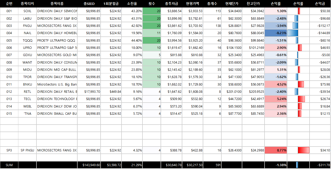 4) 4 종목을 추가하여 총 15 종목으로 무한매수법을 이어가고 있고, RETL(DIREXION DAILY RETAIL BULL 3X ETF)은 단가가 크므로 시드가 2천만 원 할당되었고, 총시드는 1억 6천으로 진행 중입니다.