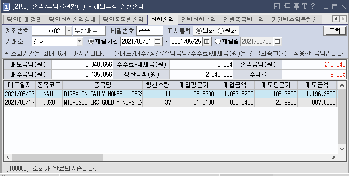 3) 또한 종목 중 GDXU(MICROSECTORS GOLD MINERS 3X LEVERAGED ETF)의 매도가 이루어져 수익이 실현되었습니다. 인플레이션 우려로 금융주, 경기민감주 등이 좋은 수익률을 보여준 결과입니다.