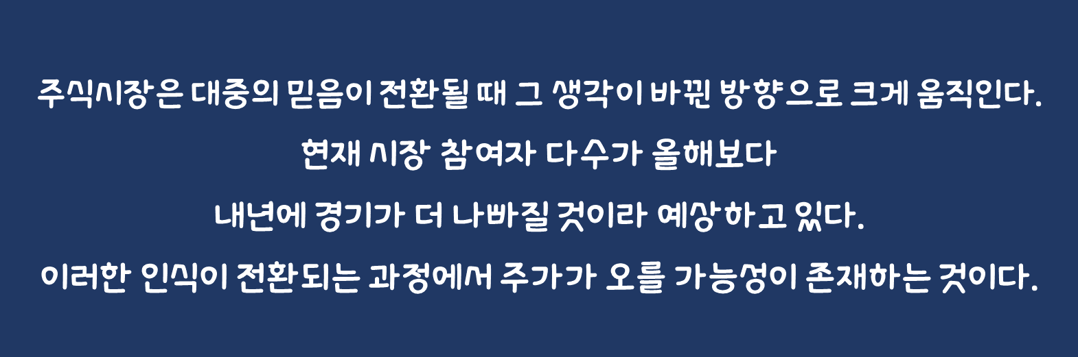 주식시장은 대중의 믿음이 전환될 때 그 생각이 바뀐 방향으로 크게 움직인다. 현재 시장 참여자 다수가 올해보다 내년에 경기가 더 나빠질 것이라 예상하고 있다. 이러한 인식이 전환되는 과정에서 주가가 오를 가능성이 존재하는 것이다. 이것이 우리가 내년 주식시장을 강하게 보는 이유이기도 하다.