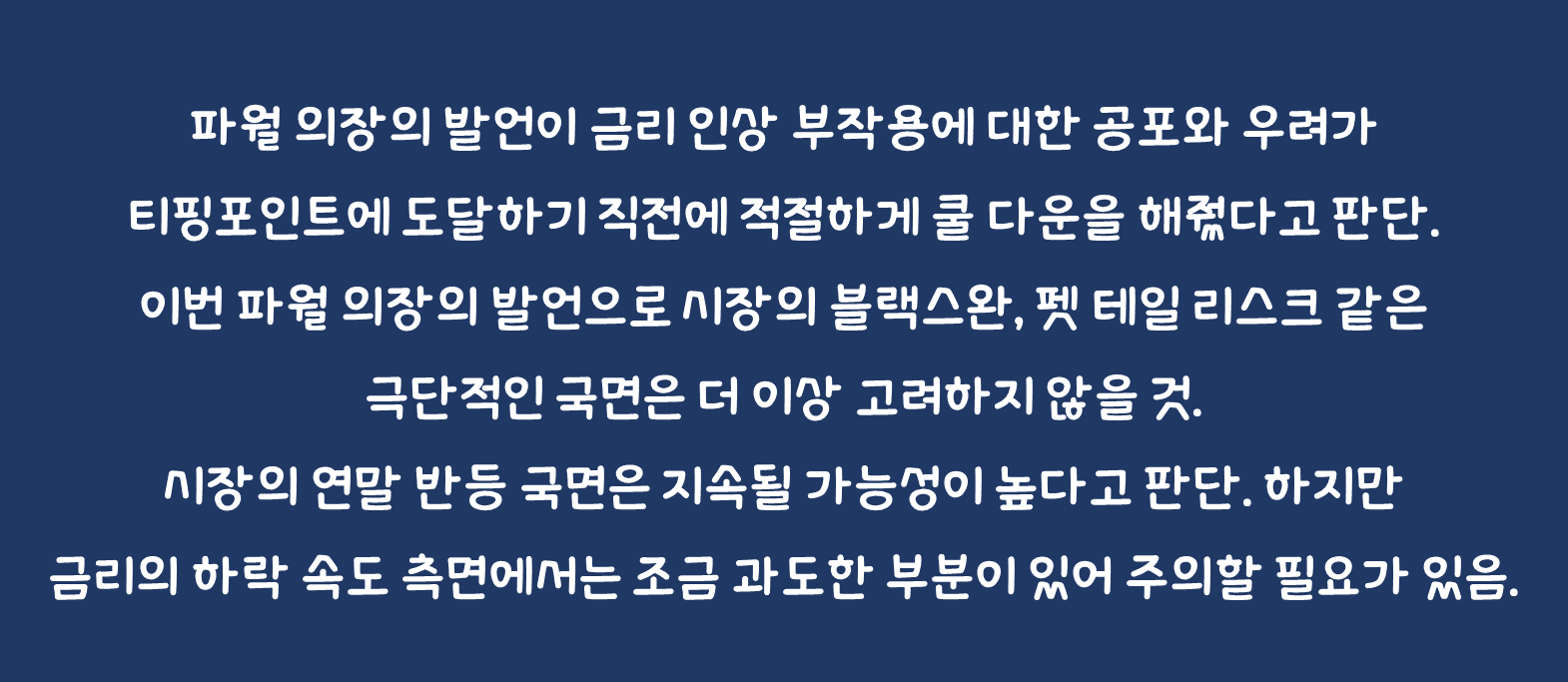 • 다행스럽게도 파월 의장의 발언이 금리 인상 부작용에 대한 공포와 우려가 티핑포인트에 도달하기 직전에 적절하게 쿨 다운을 해줬다고 판단. 지난 10월 물가지표의 하락과 더불어 이번 파월 의장의 발언으로 시장의 블랙스완, 펫 테일 리스크 같은 극단적인 국면은 더 이상 고려하지 않을 것.