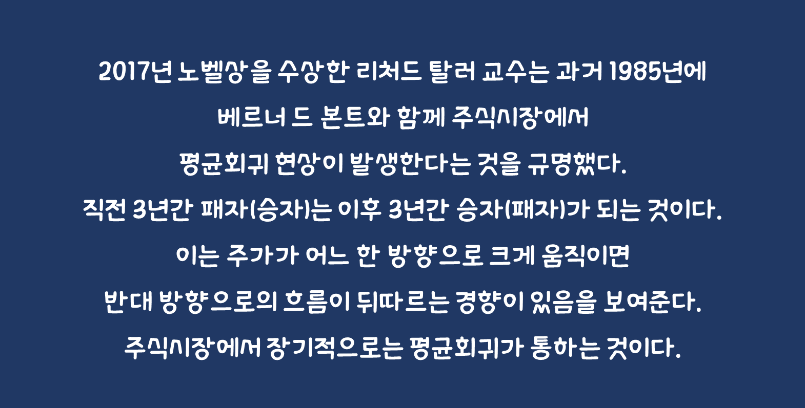 2017년 노벨상을 수상한 리처드 탈러 교수는 과거 1985년에 베르너 드 본트와 함께 주식시장에서 평균회귀 현상이 발생한다는 것을 규명했다. 투자자들의 미래에 대한 과도한 낙관이나 비관에 따라 과잉 반응이 나타나면 주가는 균형을 이탈한다. 그리고 이후 오랜 기간에 걸쳐서 왜곡된 주가가 정상화된다는 것이다.