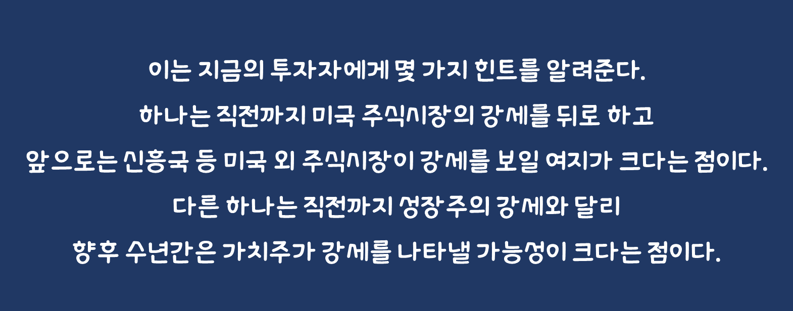 이는 지금의 투자자에게 몇 가지 힌트를 알려준다. 하나는 직전까지 미국 주식시장의 강세를 뒤로 하고 앞으로는 신흥국 등 미국 외 주식시장이 강세를 보일 여지가 크다는 점이다. 다른 하나는 직전까지 성장주의 강세와 달리 향후 수년간은 가치주가 강세를 나타낼 가능성이 크다는 점이다. 해외주식 투자의 관점에서는,