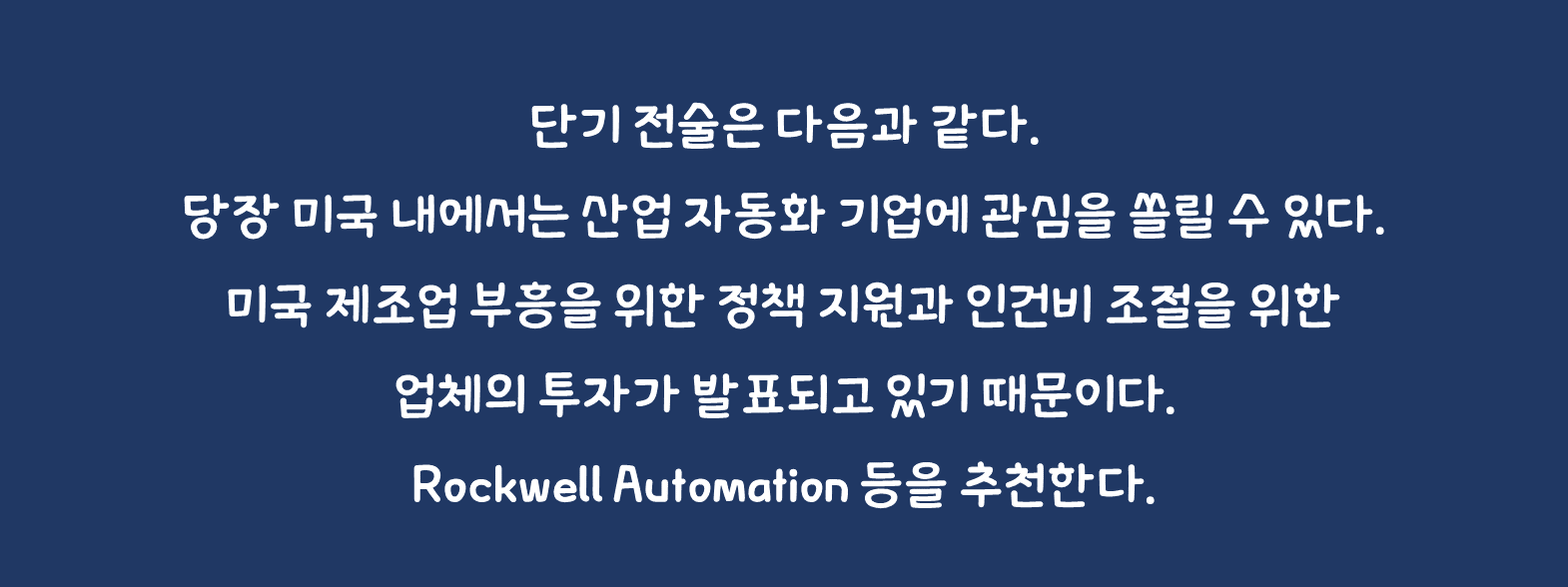 수익률 보강을 위하여 실행할 수 있는 단기 전술은 다음과 같다. 당장 미국 내에서는 산업 자동화 기업에 관심을 쏠릴 수 있다. 미국 제조업 부흥을 위한 정책 지원과 인건비 조절을 위한 업체의 투자가 발표되고 있기 때문이다. Rockwell Automation 등을 추천한다. 중국에서는 플랫폼 기업의 숨통이 트일 수 있음을 주목한다. 상무회의에서 관련 산업 발전을 언급하고 있으며, 더불어 게임 규제 완화가 거론되고, 월드컵 방영 등이 매개 역할을 할 것으로 여겨진다. 텐센트 등을 추천한다.