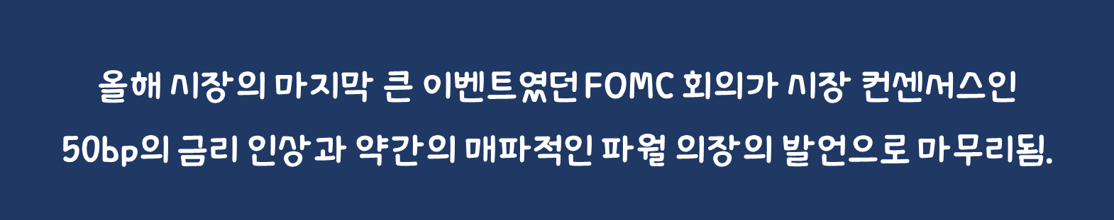 • 올해 시장의 마지막 큰 이벤트였던 FOMC 회의가 시장 컨센서스인 50bp의 금리 인상과 약간의 매파적인 파월 의장의 발언으로 마무리됨. 세부적으로 경제성장률은 하향, 물가와 실업률 전망은 상향, 그리고 기준금리 고점을 소폭 상향 조정하였음. 일부 변화에도 불구 주식시장의 반응은 컨센서스를 크게 벗어나지 않았다는 점에서 변동성은 제한적인 모습을 띈 것이 특징.