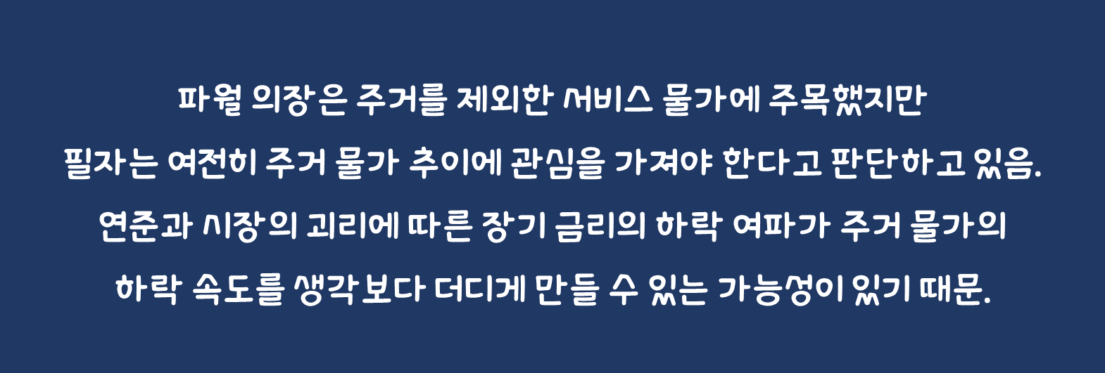 • 파월 의장은 주거를 제외한 서비스 물가에 주목했지만 필자는 여전히 주거 물가 추이에 관심을 가져야 한다고 판단하고 있음. 연준과 시장의 괴리에 따른 장기 금리의 하락 여파가 주거 물가의 하락 속도를 생각보다 더디게 만들 수 있는 가능성이 있기 때문.