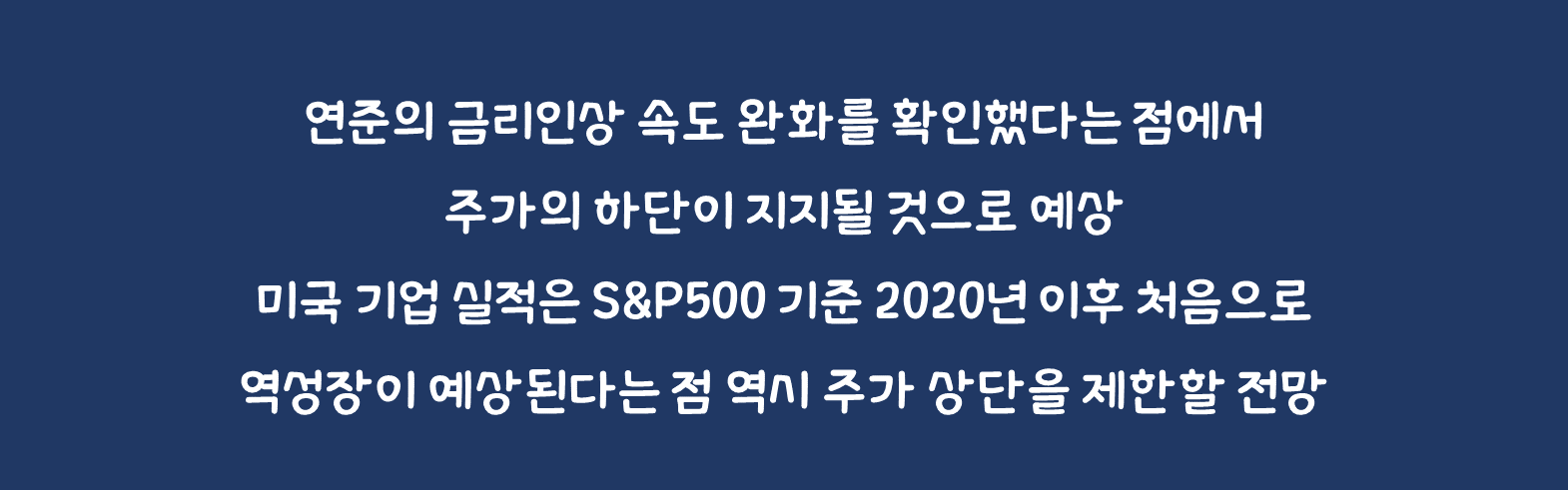 월간 전망: 연준의 금리인상 속도 완화를 확인했다는 점에서 주가의 하단이 지지될 것으로 예상. 하지만 여전히 금리 인하를 기대하는 시장과 그 기대감을 낮추는 연준의 정책 간극이 좁혀질 필요가 존재. 이는 시장의 부담 요인. 한편 1월부터 시작되는 2022년 4분기 미국 기업 실적은 S&P500 기준 2020년 이후 처음으로 역성장이 예상된다는 점 역시 주가 상단을 제한할 전망