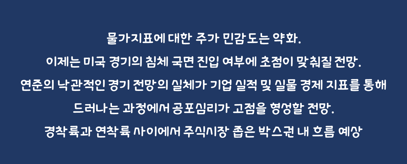 월간 전망: 물가지표에 대한 주가 민감도는 약화. 이제는 미국 경기의 침체 국면 진입 여부에 초점이 맞춰질 전망. 연준의 낙관적인 경기 전망의 실체가 기업 실적 및 실물 경제 지표를 통해 드러나는 과정에서 공포심리가 고점을 형성할 전망. 테크 및 금융 기업들을 중심으로 나타나는 감원 소식에 미국 고용지표는 점차 둔화될 전망. 2023년상반기 내 미국 경제성장률은 마이너스 국면 진입할 것으로 전망. 미국 기업들의 실적 바닥도 상반기 나타날 것. 경착륙과 연착륙 사이에서 주식시장 좁은 박스권 내 흐름 예상