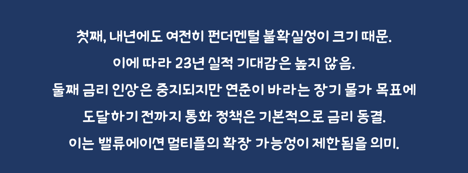 첫째, 내년에도 여전히 펀더멘털 불확실성이 크기 때문. 고강도 긴축에 따른 경기 위험은 물론, 경기에 대한 논란을 차치하고서라도 확실한 건 내년 미국의 경기가 잠재 성장률을 하회하는 매우 낮은 수준을 유지한다는 것. 이에 따라 '23년 실적 기대감은 높지 않음. 과거 미국의 저성장 국면에서 S&P 500 EPS 성장률은 평균 1.4%에 그쳤음. 둘째 금리 인상은 중지되지만 연준이 바라는 장기 물가 목표에 도달하기 전까지 통화 정책은 기본적으로 금리 동결. 이는 밸류에이션 멀티플의 확장 가능성이 제한됨을 의미. 과거 금리 인하에 대한 시장 컨센서스가 형성되기 전까지 채권금리와 P/E 멀티플은 일정 범위 내에서 갇혀 있는 모습이 공통적으로 관찰. 내년 경기가 하반기부터 턴어라운드하지만 그 강도가 강하지 않고, 금리 인하를 제외한 특별한 기대 이벤트가 없다는 점에서 멀티플 확장 여지는 5~8% 내외로 크지 않을 것으로 예상.