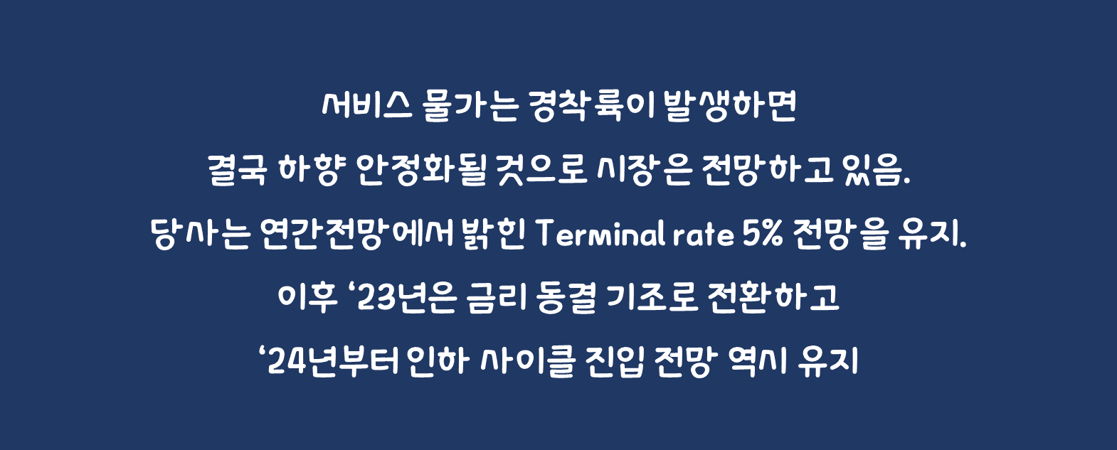 ‘23년 헤드라인 PCE와 근원 PCE가 각각 0.3%p, 0.4%p 상향 조정된 점은 부담. 그러나 파월 기준에 따르면 현재 물가를 이루는 세 가지 요인(상품, 거주비, 서비스) 중 핵심인 서비스 물가는 경착륙이 발생하면 결국 하향 안정화될 것으로 시장은 전망하고 있음. 당사는 연간전망에서 밝힌 Terminal rate 5% 전망을 유지. 이후 ‘23년은 금리 동결 기조로 전환하고 ‘24년부터 인하 사이클 진입 전망 역시 유지