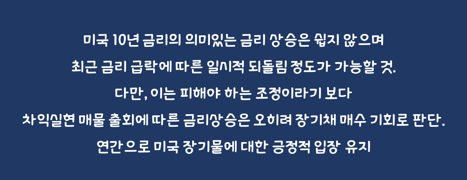 경착륙 가능성이 높아진 상황에서 연준의 Terminal rate 상향 조정은 결국 장단기 스프레드 역전 폭 확대로 귀결될 수밖에 없음. 금번 사이클에서 미국 2y/10y 스프레드 역전 폭은 100bp를 넘어설 것이라는 기존 시각 유지. 미국 10년 금리의 의미있는 금리 상승은 쉽지 않으며 최근 금리 급락에 따른 일시적 되돌림 정도가 가능할 것. 다만, 이는 피해야 하는 조정이라기 보다 차익실현 매물 출회에 따른 금리상승은 오히려 장기채 매수 기회로 판단. 연간으로 미국 장기물에 대한 긍정적 입장 유지