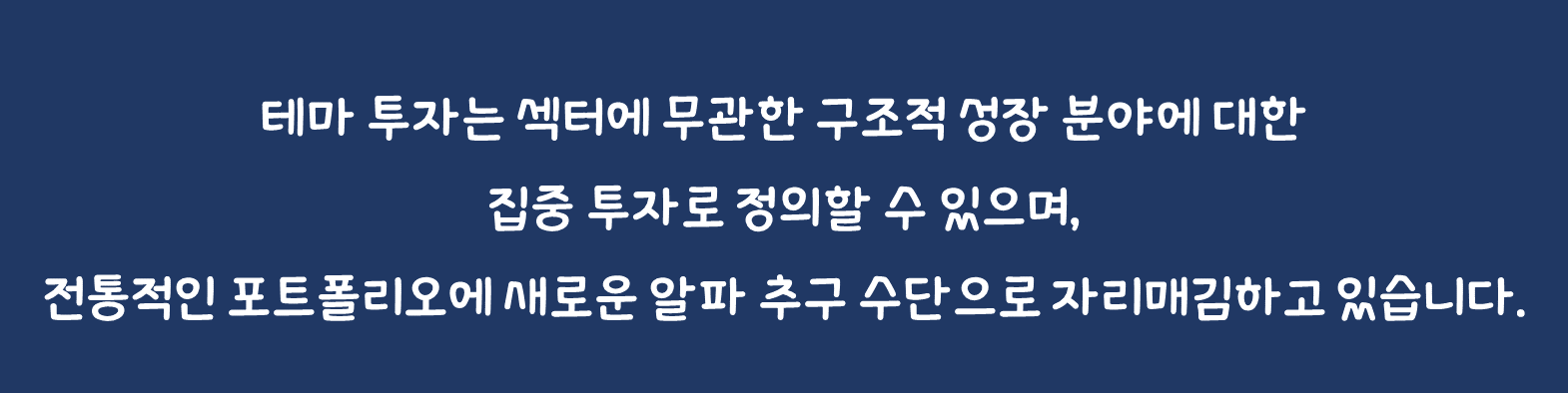 테마 투자는 섹터에 무관한 구조적 성장 분야에 대한 집중 투자로 정의할 수 있으며, 전통적인 포트폴리오에 새로운 알파 추구 수단으로 자리매김하고 있습니다. 2022년 주식시장 조정에 따라 글로벌 테마 ETF의 성장세는 주춤했지만 국내 테마 ETF에는 자금이 유입되었습니다. 2023년에는 미국 인프라 투자 테마, 로봇/자동화, 친환경/신재생 에너지, K-컬처 테마 ETF에서 알파를 찾을 수 있을 것입니다.