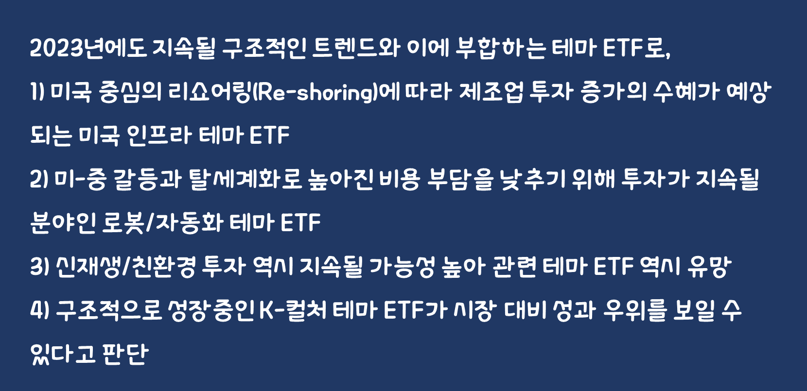 테마 ETF는 전통적인 포트폴리오에 섹터와 스타일 투자 외에 새로운 알파 추구 기회를 제공. 2023년에도 지속될 구조적인 트렌드와 이에 부합하는 테마 ETF로 1) 미국 중심의 리쇼어링(Re-shoring)에 따라 제조업 투자 증가의 수혜가 예상되는 미국 인프라 테마 ETF, 2) 미-중 갈등과 탈세계화로 높아진 비용 부담을 낮추기 위해 투자가 지속될 분야인 로봇/자동화 테마 ETF가 있음. 3) 신재생/친환경 투자 역시 지속될 가능성 높아 관련 테마 ETF 역시 유망. 마지막으로 경기에 무관하게 4) 구조적으로 성장중인 K-컬처 테마 ETF가 시장 대비 성과 우위를 보일 수 있다고 판단.