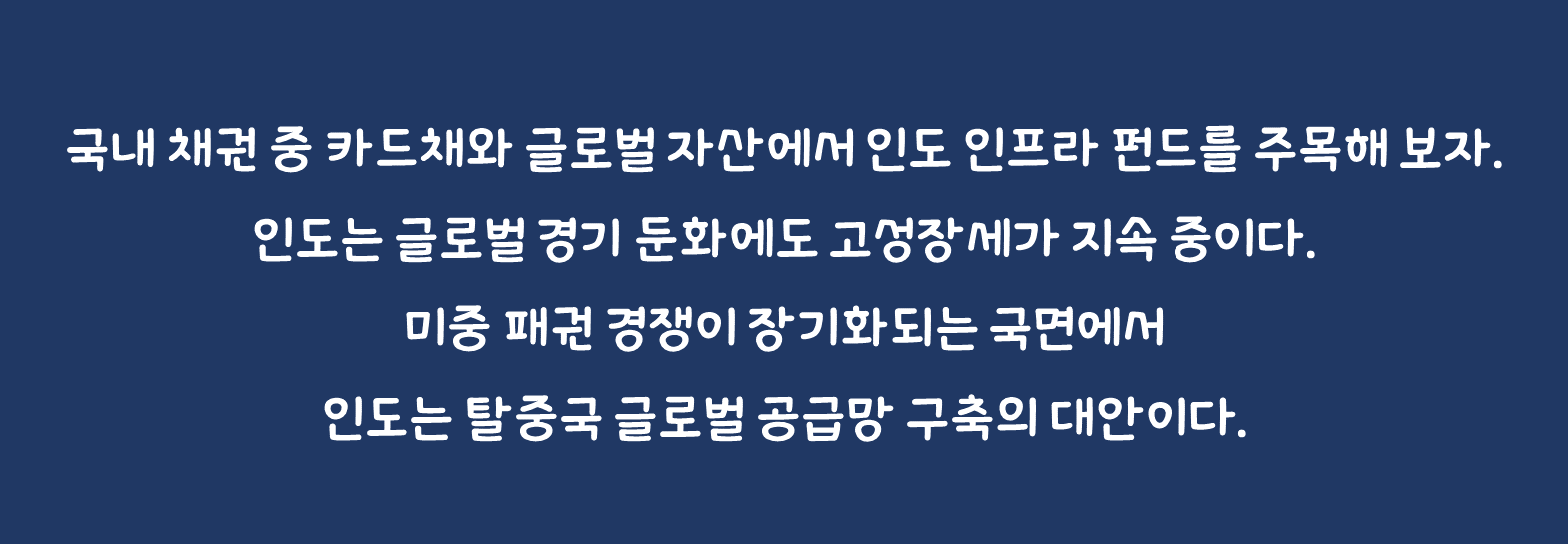 국내 채권 중 카드채와 글로벌 자산에서 인도 인프라 펀드를 주목해 보자. 카드채는 동일 등급 회사채보다 절대금리가 높고 PF규모가 미미하여 부동산 침체로 인한 잠재적인 손실이 제한적이다. 연초 기관들의 자금유입도 기대된다. 인도는 글로벌 경기 둔화에도 고성장세가 지속 중이다. 미중 패권 경쟁이 장기화되는 국면에서 인도는 탈중국 글로벌 공급망 구축의 대안이다. 인프라확충은 정부의 최우선 국정과제로 인도 인프라 섹터는 식어가는 중국의 성장엔진을 대체할 것이다.