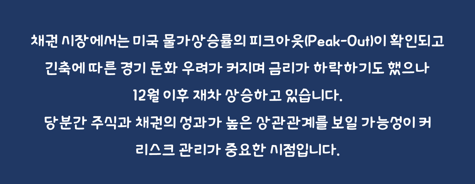 한동안 안정을 찾았던 금융시장의 변동성이 다시 높아지고 있습니다. 채권 시장에서는 미국 물가상승률의 피크아웃(Peak-Out)이 확인되고 긴축에 따른 경기 둔화 우려가 커지며 금리가 하락하기도 했으나 12월 이후 재차 상승하고 있습니다. 주식시장 역시 반등을 이어가지 못하고 하락하는 모습입니다. 당분간 주식과 채권의 성과가 높은 상관관계를 보일 가능성이 커 리스크 관리가 중요한 시점입니다.