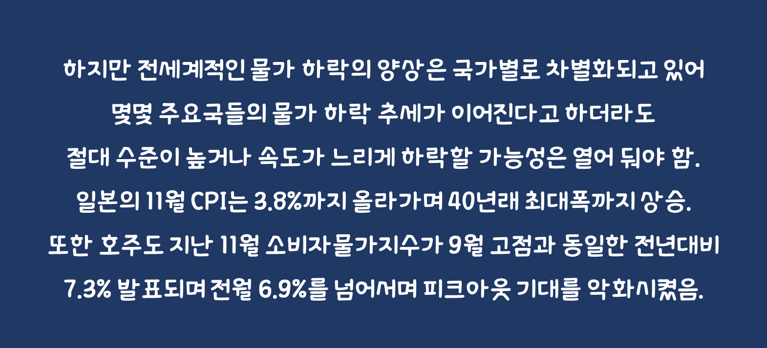• 또한 호주도 지난 11월 소비자물가지수가 9월 고점과 동일한 전년대비 7.3% 발표되며 전월 6.9%를 넘어서며 피크아웃 기대를 악화시켰음, 근원 소비자물가지수도 전월 6.4%에서 6.7%로 확대되며 물가 상승세가 아직 끝나지 않았음을 시사하는 등 국가별로 물가 하락 국면은 차별화되고 있음.