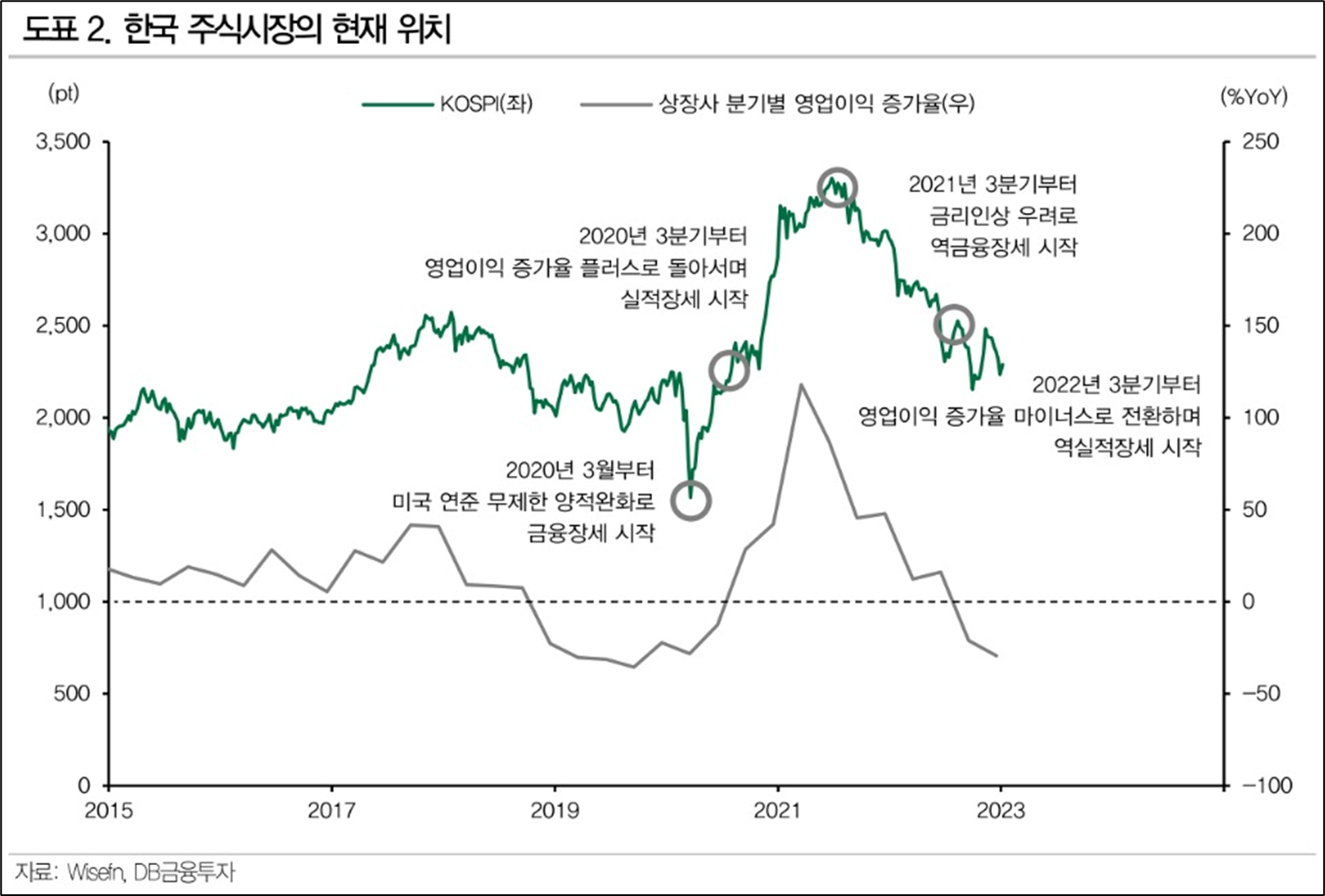 △ 그다음은 역실적장세가 남아있다. 다만, 역실적장세 역시 일정 수준 진행됐다는 것을 능히 짐작할 수 있다. 한국 주식시장 상장사 전체의 실적이 떨어진 것은 2022년 3분기부터였기 때문이다. 따라서 현재 한국 주식시장은 역실적장세의 중반에 위치한다고 판단한다.