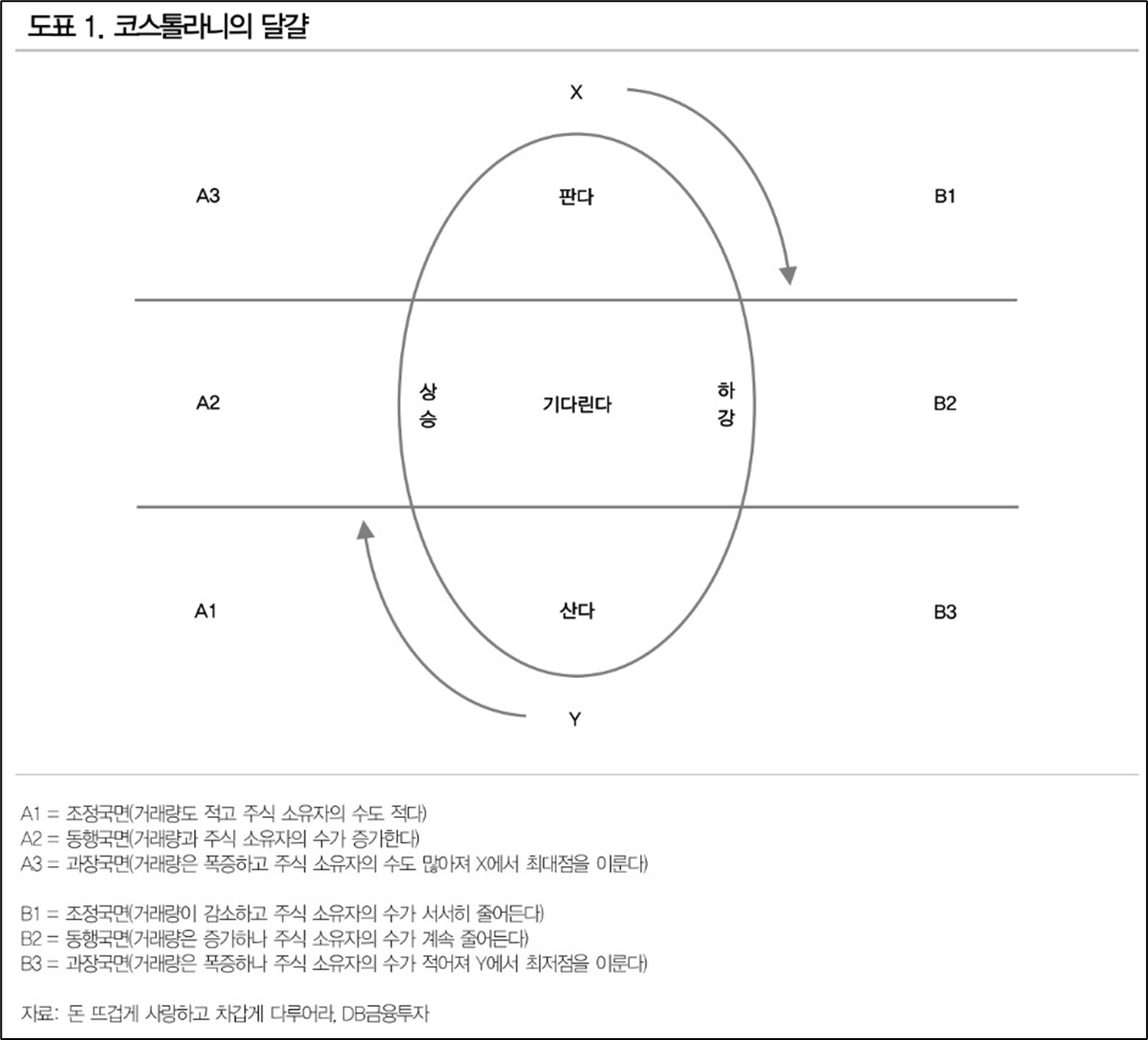금일은 동서양의 장세 판단법에 한국의 주식시장을 비춰보는 두 번째 시간으로 서양의 방법을 적용해 보고자 한다. 이는 앙드레 코스톨라니가 그의 저서 '돈 뜨겁게 사랑하고 차갑게 다루어라'에서 언급한 코스톨라니의 달걀이 대표적이다. 직전 시간에 살펴봤던 동양의 장세 판단법인 우라가미 구니오의 주식시장 사계절은 매크로 환경에 관한 패턴 인식의 형태였다. 반면, 코스톨라니의 달걀은 주식시장의 분위기를 경험칙으로 평가하는 방식이다.
