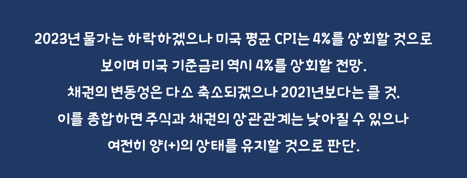 2023년 물가는 하락하겠으나 미국 평균 CPI는 4%를 상회할 것으로 보이며 미국 기준금리 역시 4%를 상회할 전망. 채권의 변동성은 다소 축소되겠으나 2021년보다는 클 것. 이를 종합하면 주식과 채권의 상관관계는 낮아질 수 있으나 여전히 양(+)의 상태를 유지할 것으로 판단.