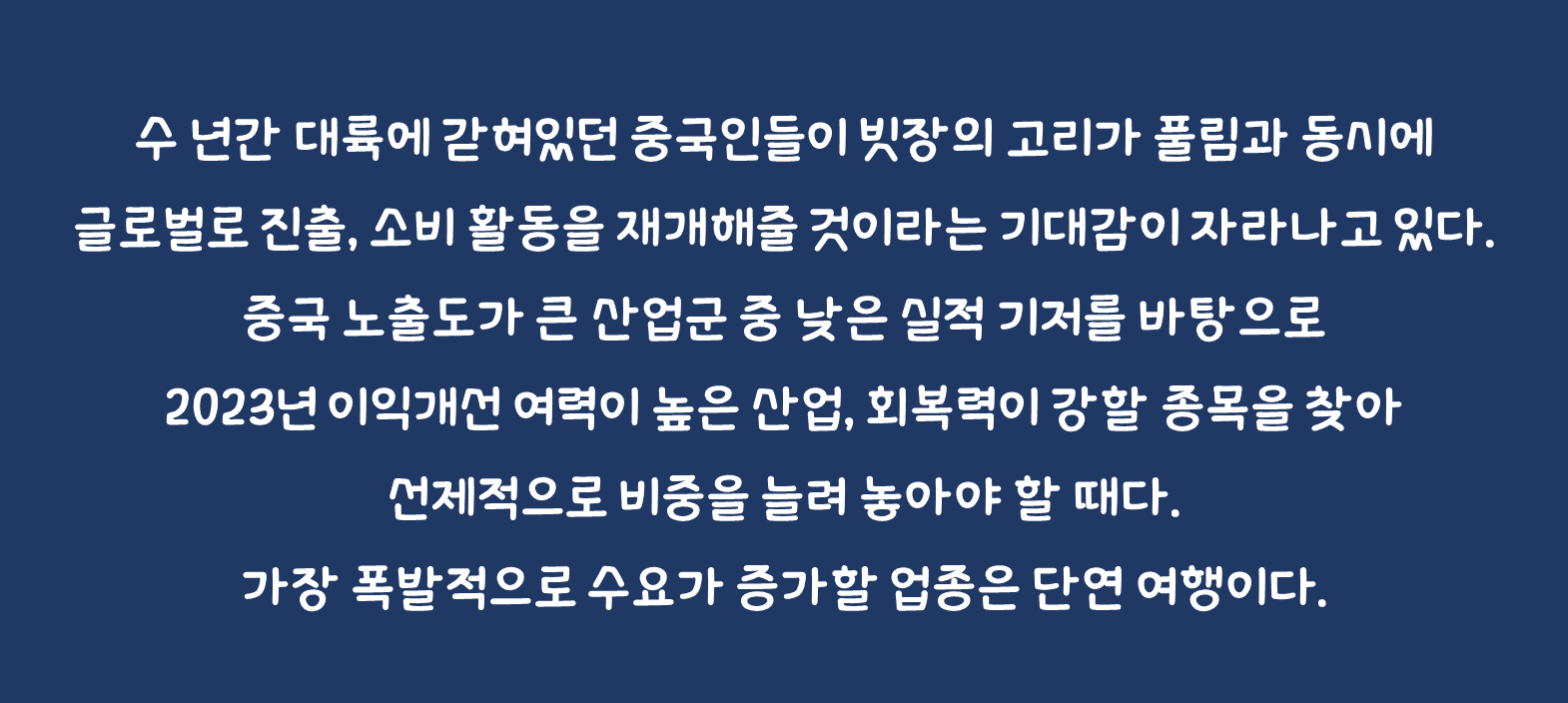 중국 노출도가 큰 산업군 중 낮은 실적 기저를 바탕으로 2023년 이익개선 여력이 높은 산업, 회복력이 강할 종목을 찾아 선제적으로 비중을 늘려 놓아야 할 때다. 코로나 바이러스 확산 이후 일상생활 정상화 전철을 먼저 밟고 있는 미국과 한국의 사례를 미루어 보았을 때 가장 폭발적으로 수요가 증가할 업종은 단연 여행이다. 이제는 글로벌 국가들도 대부분 국경을 개방했기 때문에 해외여행 수요가 되살아날 수 있는 긍정적 환경이다. 최근 한국 정부가 중국인에 대한 입국 절차를 강화, 이에 맞대응해 중국도 한국인에 대한 단기 비자발급을 중단했지만 이는 정치적 이슈에서 발발된 조치가 아닌 만큼 확진자 수 증가세만 진정된다면 해결될 수 있는 외부 변수로 판단한다.