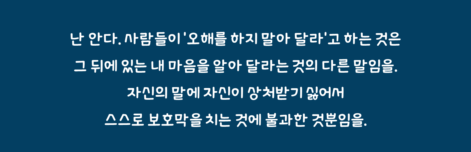 난 안다. 사람들이 '오해를 하지 말아 달라'고 하는 것은 그 뒤에 있는 내 마음을 알아 달라는 것의 다른 말임을. 자신의 말에 자신이 상처받기 싫어서 스스로 보호막을 치는 것에 불과한 것뿐임을.