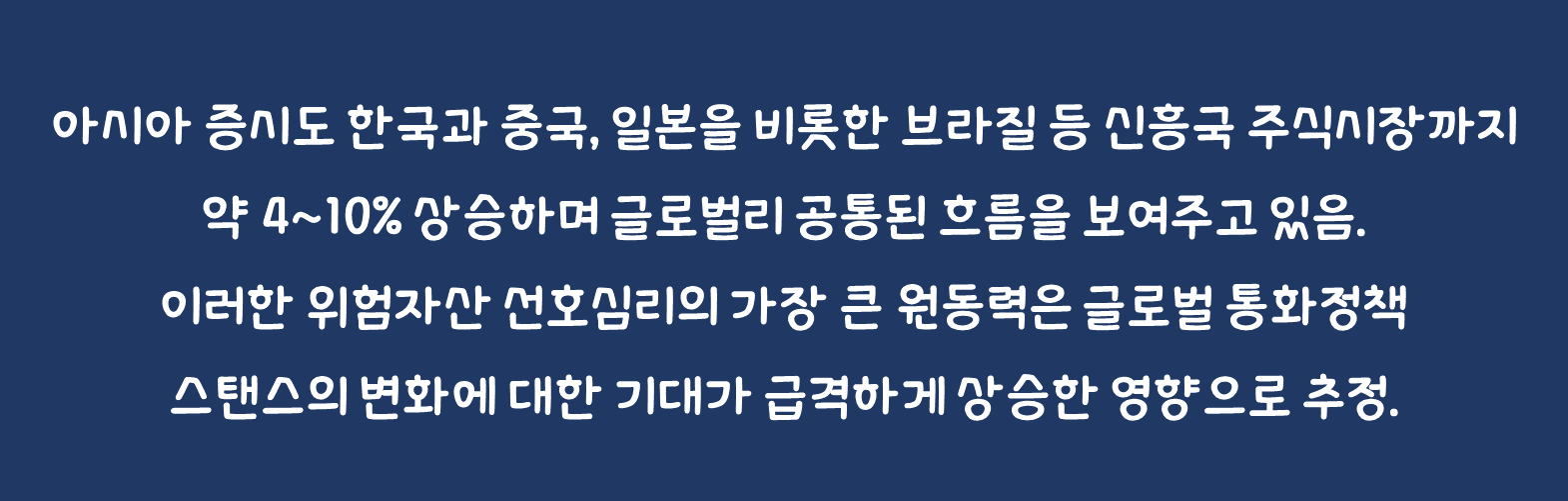 • 아시아 증시도 한국과 중국, 일본을 비롯한 브라질 등 신흥국 주식시장까지 약 4~10% 상승하며 글로벌리 공통된 흐름을 보여주고 있음. 이러한 위험자산 선호심리의 가장 큰 원동력은 글로벌 통화정책 스탠스의 변화에 대한 기대가 급격하게 상승한 영향으로 추정.