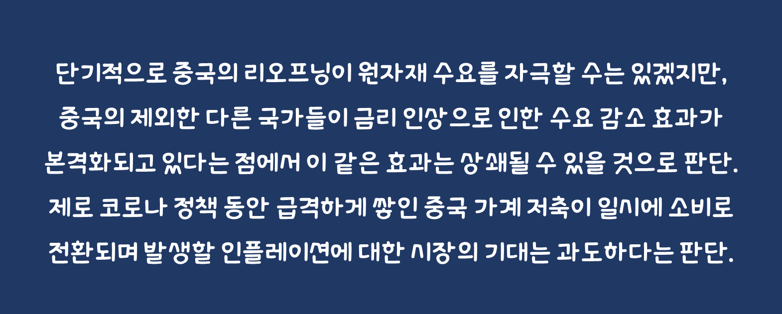 • 단기적으로 중국의 리오프닝이 원자재 수요를 자극할 수는 있겠지만, 중국의 제외한 다른 국가들이 금리 인상으로 인한 수요 감소 효과가 본격화되고 있다는 점에서 이 같은 효과는 상쇄될 수 있을 것으로 판단. 또한 리오프닝으로 인한 중국의 공급망 정상화가 만들어 낼 디플레 요인 및 코로나라는 미증유의 사태를 겪으며 사회 안전망에 대한 의구심이 증가한 중국인들의 행동심리학적 태도 변화도 고려가 필요. 이에 따라 제로 코로나 정책 동안 급격하게 쌓인 중국 가계 저축이 일시에 소비로 전환되며 발생할 인플레이션에 대한 시장의 기대는 과도하다는 판단.