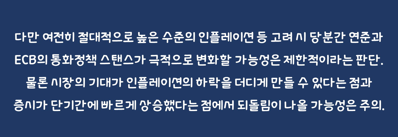 • 다만 여전히 절대적으로 높은 수준의 인플레이션 등 고려 시 당분간 연준과 ECB의 통화정책 스탠스가 극적으로 변화할 가능성은 제한적이라는 판단. 다만, 미국의 M2 증가율이 집계 이후 최초로 마이너스로 전환되는 등 유동성 환경의 변화가 나타나고 있어 과거 시장의 통화정책 변화에 대한 섣부른 기대와 달리 현재는 시장의 기대는 일면 타당한 부분이 있다는 점은 차이점. 물론 시장의 기대가 인플레이션의 하락을 더디게 만들 수 있다는 점과 증시가 단기간에 빠르게 상승했다는 점에서 되돌림이 나올 가능성은 주의(1.13).