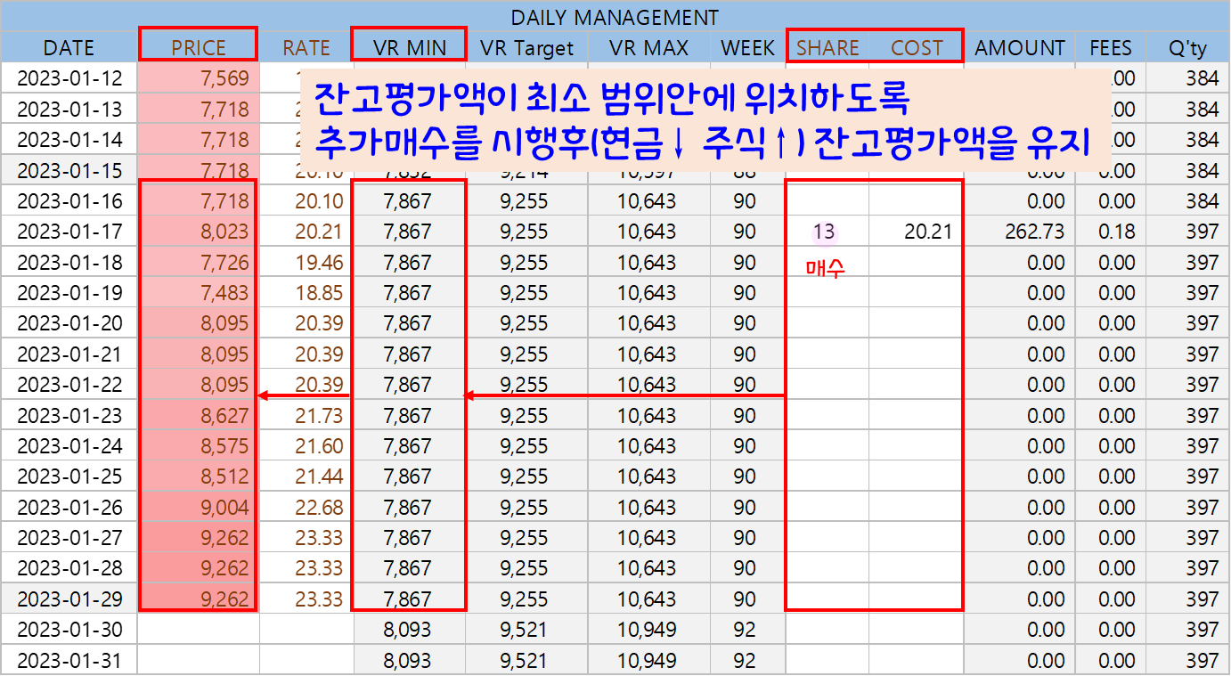 주머니(Pool)를 별도 하나 만들어 두고 매월 일정 금액을 꾸준히 주머니(Pool)에 적립하고, 평가액이 목표 value보다 낮으면 주머니(Pool)에서 투자금을 꺼내 추가 매수하여 목표 value에 맞추고, 반대로 평가액이 목표 value보다 크다면 일부 매도하여 목표 value에 맞춤과 동시에 수익은 주머니(Pool)에 다시 넣어두고 추후 매수에 사용할 수 있도록 여력을 비축하는 거였어요.