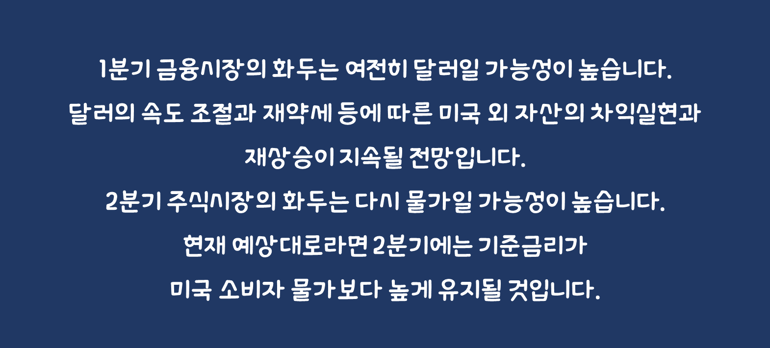 2022년 우리를 힘들게 했던 자산인 암호화폐, 홍콩, 유럽, 이머징, 중국 등의 주가지수가 상승하고 있습니다. 미국 금리인상의 끝이 멀지 않았다는 기대, 유럽의 온화한 날씨, 중국의 리오프닝 정책, 일본의 통화정책 변화 기대 등이 달러 약세를 이끌며 나타난 현상입니다. 1분기 금융시장의 화두는 여전히 달러일 가능성이 높습니다. 달러의 속도 조절과 재약세 등에 따른 미국 외 자산의 차익실현과 재상승이 지속될 전망입니다. 2분기 주식시장의 화두는 다시 물가일 가능성이 높습니다. 현재 예상대로라면 2분기에는 기준금리가 미국 소비자 물가보다 높게 유지될 것입니다.