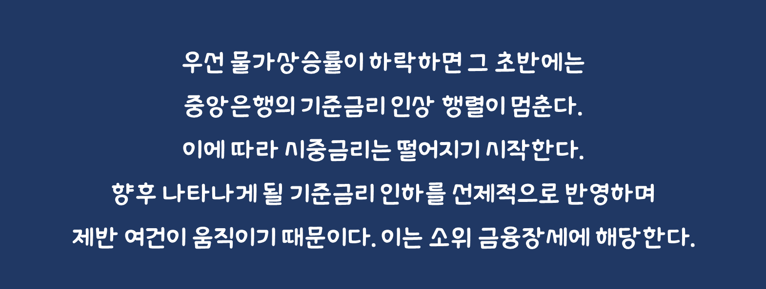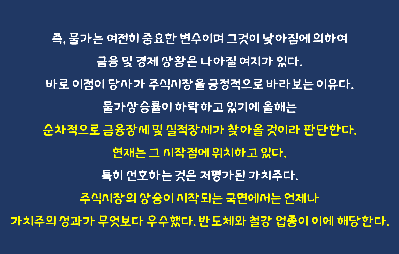 즉, 물가는 여전히 중요한 변수이며 그것이 낮아짐에 의하여 금융 및 경제 상황은 나아질 여지가 있다. 바로 이점이 당사가 주식시장을 긍정적으로 바라보는 이유다. 물가상승률이 하락하고 있기에 올해는 순차적으로 금융장세 및 실적장세가 찾아올 것이라 판단한다. 현재는 그 시작점에 위치하고 있다.