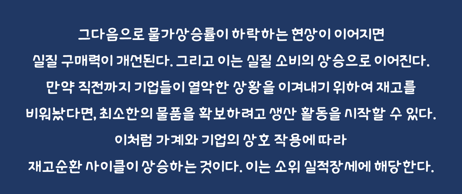 그다음으로 물가상승률이 하락하는 현상이 이어지면 실질 구매력이 개선된다. 그리고 이는 실질 소비의 상승으로 이어진다. 만약 직전까지 기업들이 열악한 상황을 이겨내기 위하여 재고를 비워놨다면, 최소한의 물품을 확보하려고 생산 활동을 시작할 수 있다. 이처럼 가계와 기업의 상호 작용에 따라 재고순환 사이클이 상승하는 것이다. 이는 소위 실적장세에 해당한다. 직전까지 무너졌던 기업실적은 차츰 나아지며 주식시장은 상승을 이어가게 된다. 향후를 보면 2023년 중반부터는 물가상승률 하락의 누적에 기 언급한 메커니즘이 작동하며 기업실적이 오를 여지가 있다. 실적장세가 도래할 요인이 존재한다는 뜻이다.