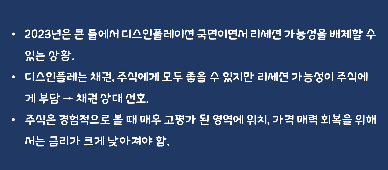 - 2023년은 큰 틀에서 디스인플레이션 국면이면서 리세션 가능성을 배제할 수 있는 상황.