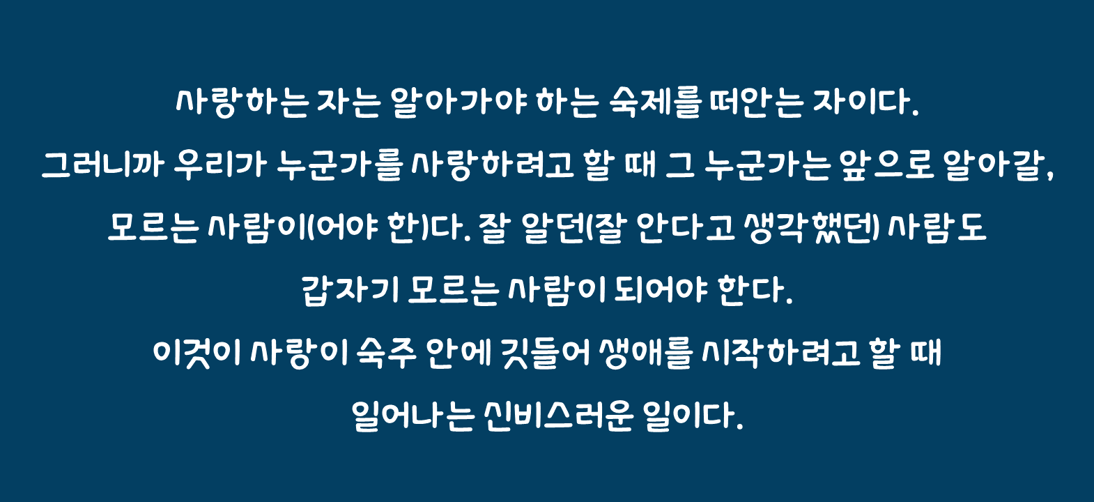 사랑하는 자는 알아가야 하는 숙제를 떠안는 자이다. 그러니까 우리가 누군가를 사랑하려고 할 때 그 누군가는 앞으로 알아갈, 모르는 사람이(어야 한)다. 잘 알던(잘 안다고 생각했던) 사람도 갑자기 모르는 사람이 되어야 한다. 이것이 사랑이 숙주 안에 깃들어 생애를 시작하려고 할 때 일어나는 신비스러운 일이다.