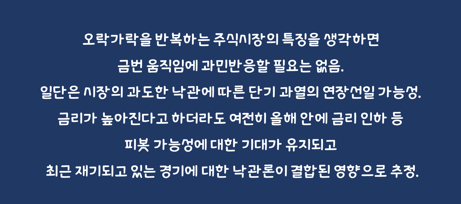 • 일단은 시장의 과도한 낙관에 따른 단기 과열의 연장선일 가능성. 금리가 높아진다고 하더라도 여전히 올해 안에 금리 인하 등 피봇 가능성에 대한 기대가 유지되고 최근 재기되고 있는 경기에 대한 낙관론이 결합된 영향으로 추정.