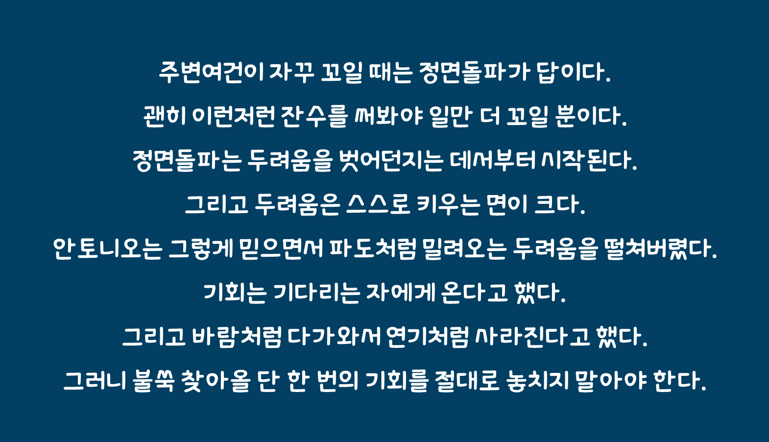 그렇지만 낙심은 오래가지 않았다. 불리할수록 불타오르는 안토니오의 투혼이 다시 작동한 것이다. 주변여건이 자꾸 꼬일 때는 정면돌파가 답이다. 괜히 이런저런 잔수를 써봐야 일만 더 꼬일 뿐이다. 정면돌파는 두려움을 벗어던지는 데서부터 시작된다. 그리고 두려움은 스스로 키우는 면이 크다. 안토니오는 그렇게 믿으면서 파도처럼 밀려오는 두려움을 떨쳐버렸다. 기회는 기다리는 자에게 온다고 했다. 그리고 바람처럼 다가와서 연기처럼 사라진다고 했다. 그러니 불쑥 찾아올 단 한 번의 기회를 절대로 놓치지 말아야 한다.