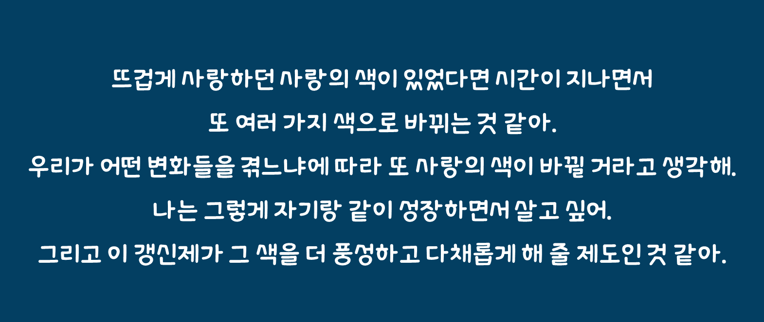 “자기, 사랑이 변했다는 게 마음이 떠났다거나 그런 것만을 이야기하는 게 아니잖아. 뜨겁게 사랑하던 사랑의 색이 있었다면 시간이 지나면서 또 여러 가지 색으로 바뀌는 것 같아. 우리가 어떤 변화들을 겪느냐에 따라 또 사랑의 색이 바뀔 거라고 생각해. 나는 그렇게 자기랑 같이 성장하면서 살고 싶어. 그리고 이 갱신제가 그 색을 더 풍성하고 다채롭게 해 줄 제도인 것 같아. 지난번 연우가 왔을 때도 이야기했지만, 어떤 제도나 계약으로 지켜져야 하는 게 사랑은 아닌 것 같아. 관계의 형태와 상관없이 사랑할 수 있어야 하잖아.”