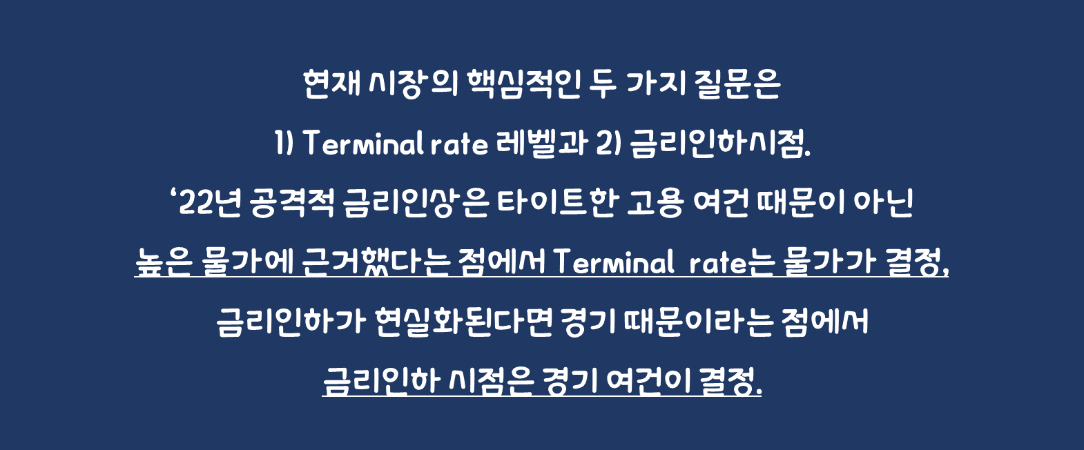 현재 시장의 핵심적인 두 가지 질문은 1) Terminal rate 레벨과 2) 금리인하시점. 이때, Terminal rate(높이)에 영향을 주는 재료와 인하 시점(기간)에 영향을 주는 재료를 구분할 필요. ‘22년 공격적 금리인상은 타이트한 고용 여건 때문이 아닌 높은 물가에 근거했다는 점에서 Terminal rate는 물가가 결정, 금리인하가 현실화된다면 경기 때문이라는 점에서 금리인하 시점은 경기 여건이 결정.