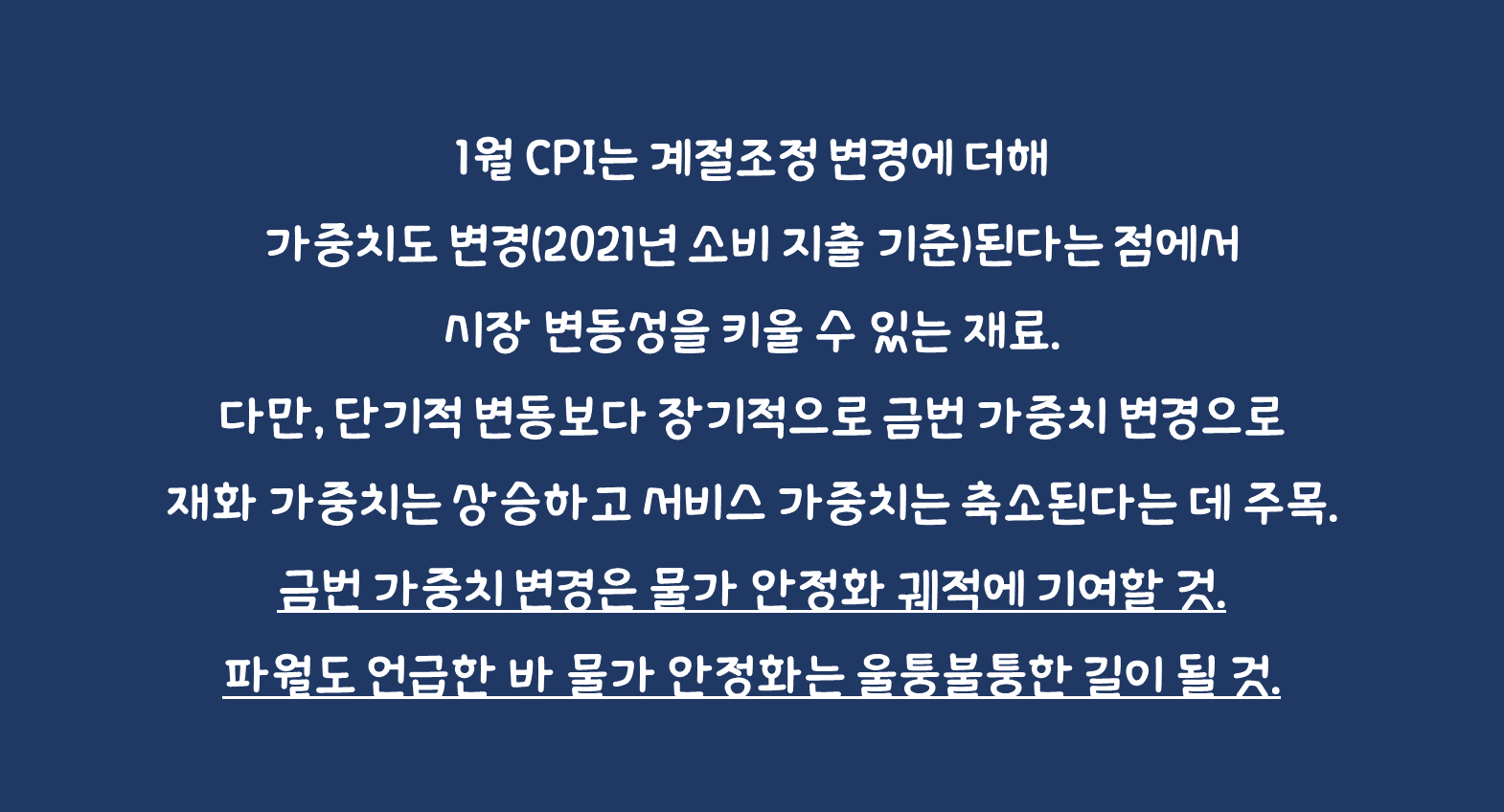 1월 물가 지표는 계절 조정 변경에 더해 가중치도 변경된다는 점에서 변동성을 키울 수 있는 재료. 다만, 장기적으로 보면 재화 가중치는 확대되고 서비스 가중치는 축소된다는 데 주목. 이는 물가 안정화 궤적에 기여할 것