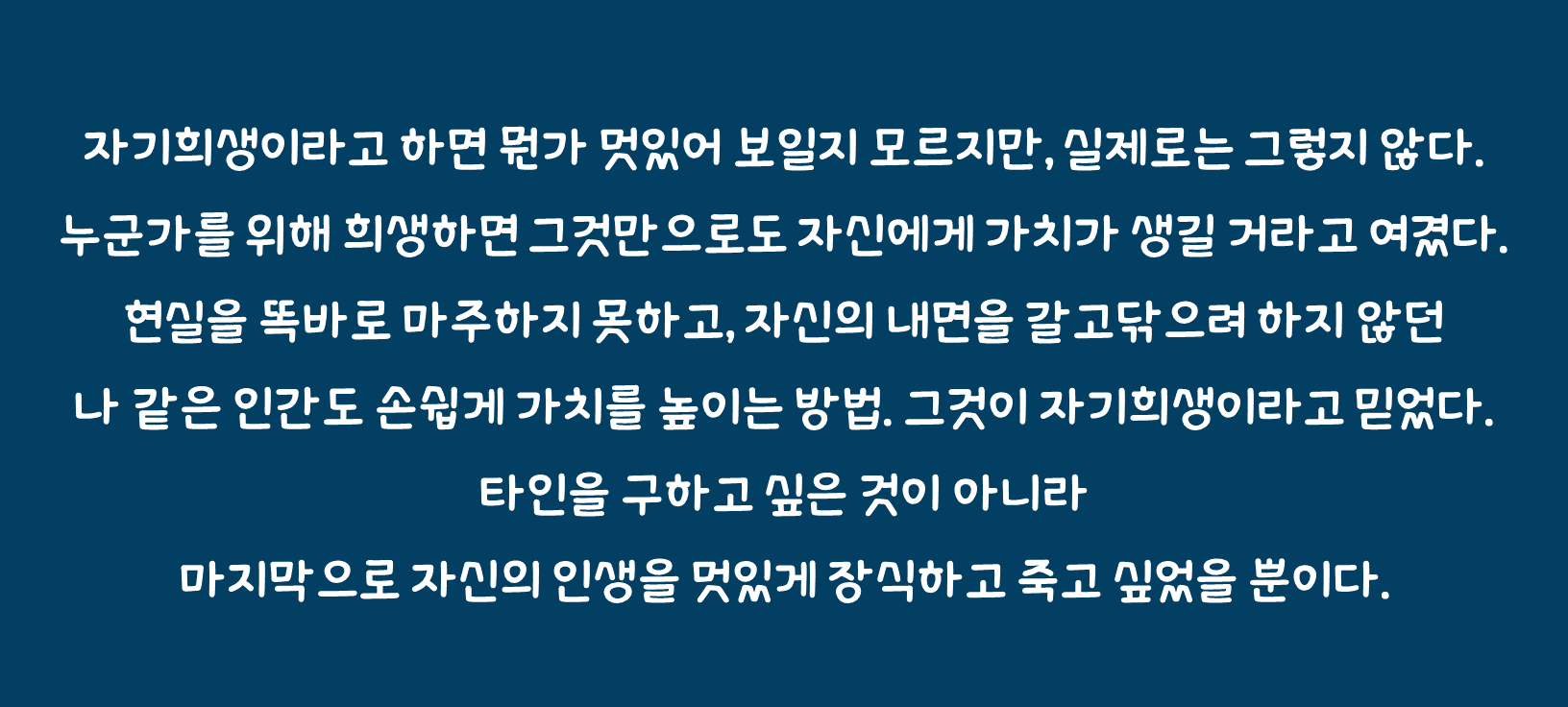 자기희생이라고 하면 뭔가 멋있어 보일지 모르지만, 실제로는 그렇지 않다. 누군가를 위해 희생하면 그것만으로도 자신에게 가치가 생길 거라고 여겼다. 현실을 똑바로 마주하지 못하고, 자신의 내면을 갈고닦으려 하지 않던 나 같은 인간도 손쉽게 가치를 높이는 방법. 그것이 자기희생이라고 믿었다. 타인을 구하고 싶은 것이 아니라 마지막으로 자신의 인생을 멋있게 장식하고 죽고 싶었을 뿐이다. 이치노세의 자살을 방해하는 것과 마찬가지로 자기중심적인 위선이다.