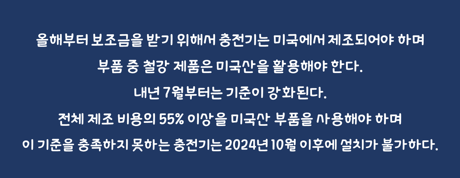 보조금 지급 대상인 미국산 전기차 충전기의 기준 확정: 미국산 전기차 충전기에 대한 기준이 지난 15일 구체화 되었다. 전기차 충전 네트워크를 구축하는 동시에 미국 제조산업 부흥을 위해, 미국 정부는 미국산 충전기에 대한 보조금 지급을 약속한바 있다. 우선 올해부터 보조금을 받기 위해서 충전기는 미국에서 제조되어야 하며 부품 중 철강 제품은 미국산을 활용해야 한다. 내년 7월부터는 기준이 강화된다. 전체 제조 비용의 55% 이상을 미국산 부품을 사용해야 하며 이 기준을 충족하지 못하는 충전기는 2024년 10월 이후에 설치가 불가하다.