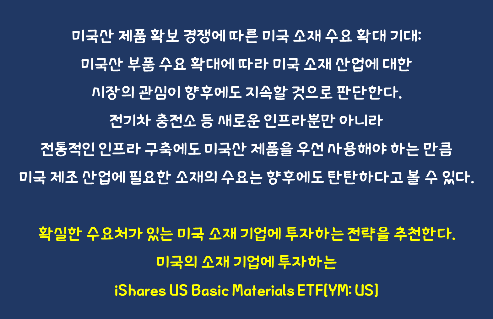 미국산 제품 확보 경쟁에 따른 미국 소재 수요 확대 기대: 미국산 부품 수요 확대에 따라 미국 소재 산업에 대한 시장의 관심이 향후에도 지속할 것으로 판단한다. 미국 공용 전기차 충전소 점유율 1위 기업인 차지포인트와 4위 블링크는 핵심 부품 중 일부를 아시아에서 수입하고 있다. 미국산 요건 확보를 위해 공급망 재편 과정이 나타날 것이다. 전기차 충전소 등 새로운 인프라뿐만 아니라 전통적인 인프라 구축에도 미국산 제품을 우선 사용해야 하는 만큼 미국 제조 산업에 필요한 소재의 수요는 향후에도 탄탄하다고 볼 수 있다. 미국의 소재 기업에 투자하는 iShares US Basic Materials ETF[YM: US]는 지난 10월 반등 이후 S&P500 보다 높은 수익률을 기록하고 있으나 미국 소재 섹터의 밸류에이션은 여전히 낮은 수준을 기록 중이다. 경기 불확실성이 존재하는 가운데 확실한 수요처가 있는 미국 소재 기업에 투자하는 전략을 추천한다.