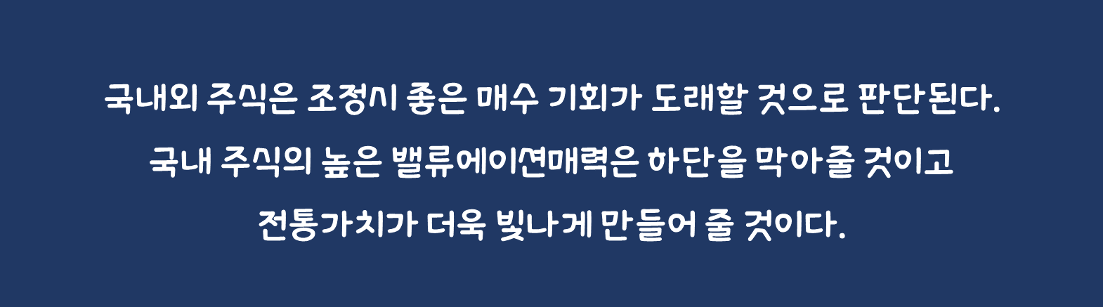 국내외 주식은 조정시 좋은 매수 기회가 도래할 것으로 판단된다. 국내 주식의 높은 밸류에이션매력은 하단을 막아줄 것이고 전통가치가 더욱 빛나게 만들어 줄 것이다. 국내외 금리는 연간으로 하방흐름은 여전히 유효하다. 다만 한두달의 시계에서는 혼란스러운 지표에 매료된 중앙은행들의 긴축 언급이 빈번해질 수 있으므로 제한적인 금리 반등이 있을 수 있다. 수익률 곡선은 단기적으로 평평해지거나 역전이 심해질 것으로 예상된다.