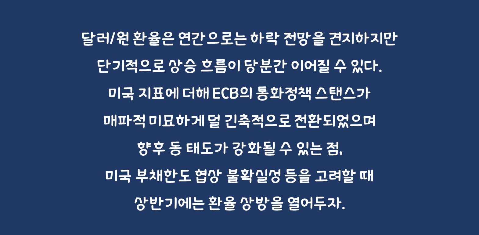 국내 크레딧 채권의 경우 단기간에 상당한 가격 강세로 인해 정상화 수준으로 되돌아갔다. AA급에 일부기회가 남아있고 보다 공격적으로 나아갈 경우 A급에 선별적으로 투자하여 수익제고의 기회를 이용하자. 달러/원 환율은 연간으로는 하락 전망을 견지하지만 단기적으로 상승 흐름이 당분간 이어질 수 있다. 미국 지표에 더해 ECB의 통화정책 스탠스가 매파적 미묘하게 덜 긴축적으로 전환되었으며 향후 동 태도가 강화될 수 있는 점, 미국 부채한도 협상 불확실성 등을 고려할 때 상반기에는 환율 상방을 열어두자.