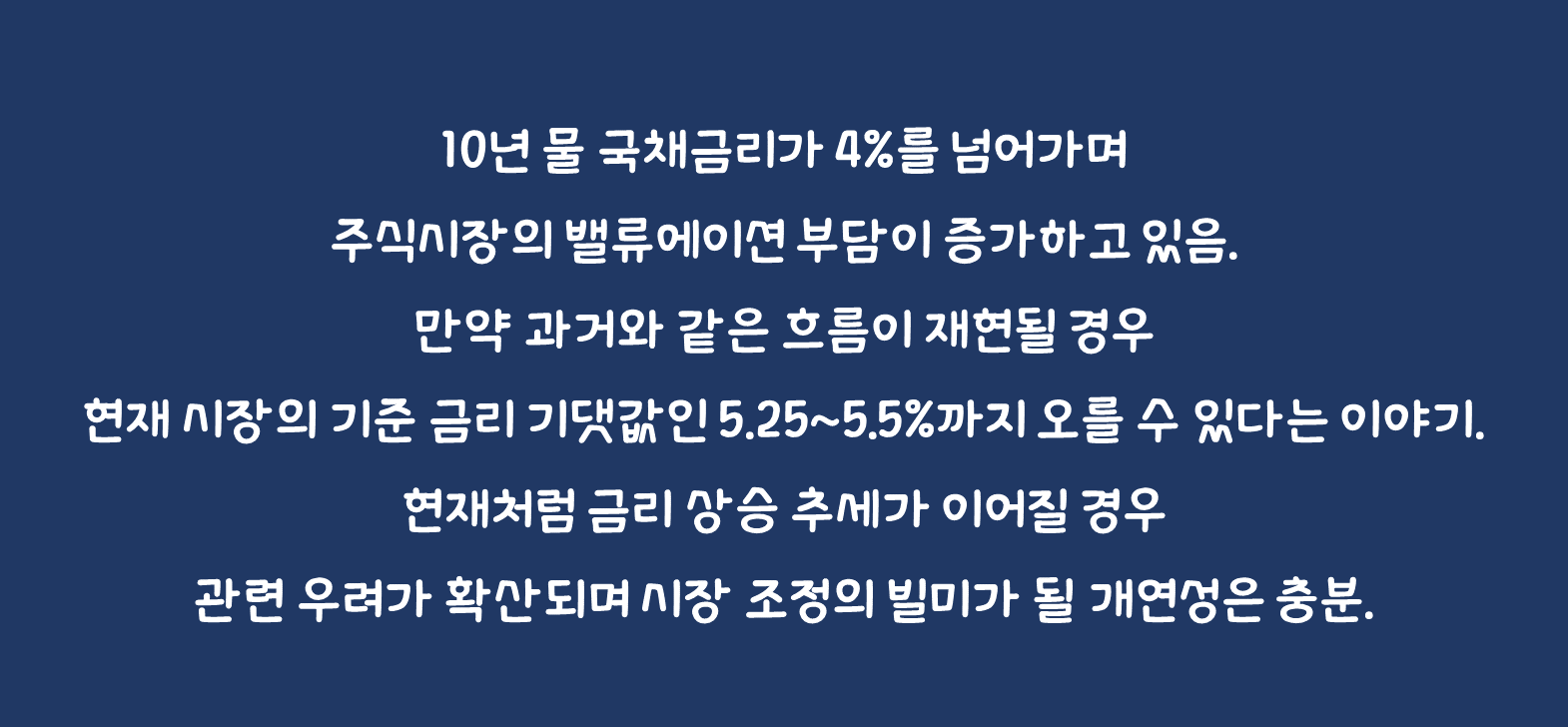 • 복합적인 요소를 고려했을 때 10년 물과 같은 장기 물 금리가 기준 금리 고점을 상회할 가능성은 낮다는 판단. 하지만 기준 금리의 영향을 많이 받는 2년 물과 같은 단기물은 최종 금리 수준이 기준 금리에 수렴할 것으로 보는 것이 합리적으로 보임. 당분간 기준 금리를 추종할 시장 금리의 흐름 속 주식시장의 조정 국면은 이어질 것으로 전망.