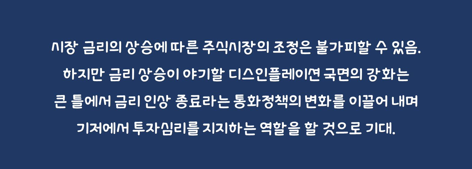 • 시장 금리의 상승에 따른 주식시장의 조정은 불가피할 수 있음. 하지만 금리 상승이 야기할 디스인플레이션 국면의 강화는 큰 틀에서 금리 인상 종료라는 통화정책의 변화를 이끌어 내며 기저에서 투자심리를 지지하는 역할을 할 것으로 기대.