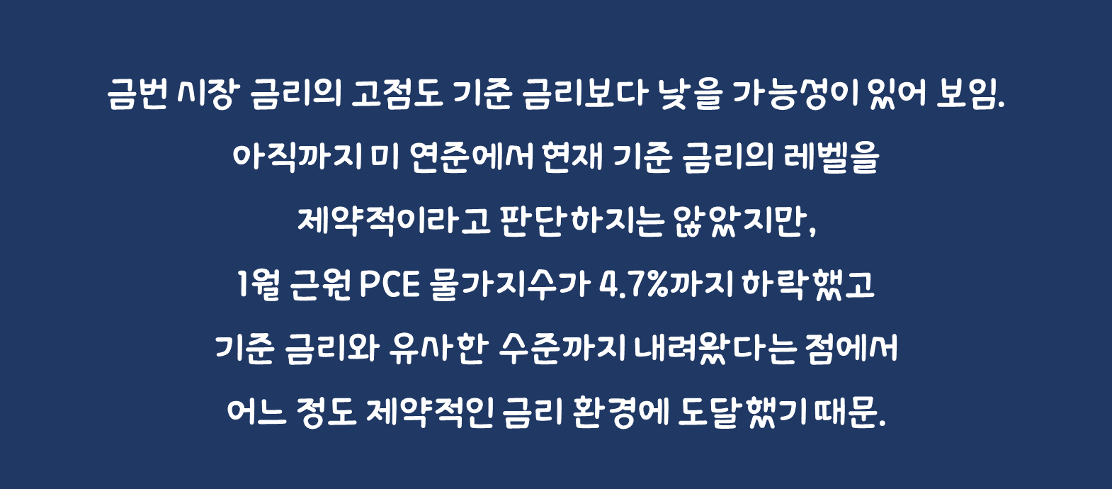 • 이러한 유사성을 고려한다면 오히려 금번 시장 금리의 고점도 기준 금리보다 낮을 가능성이 있어 보임. 아직까지 미 연준에서 현재 기준 금리의 레벨을 제약적이라고 판단하지는 않았지만, 1월 근원 PCE 물가지수가 4.7%까지 하락했고 기준 금리와 유사한 수준까지 내려왔다는 점에서 어느 정도 제약적인 금리 환경에 도달했기 때문.