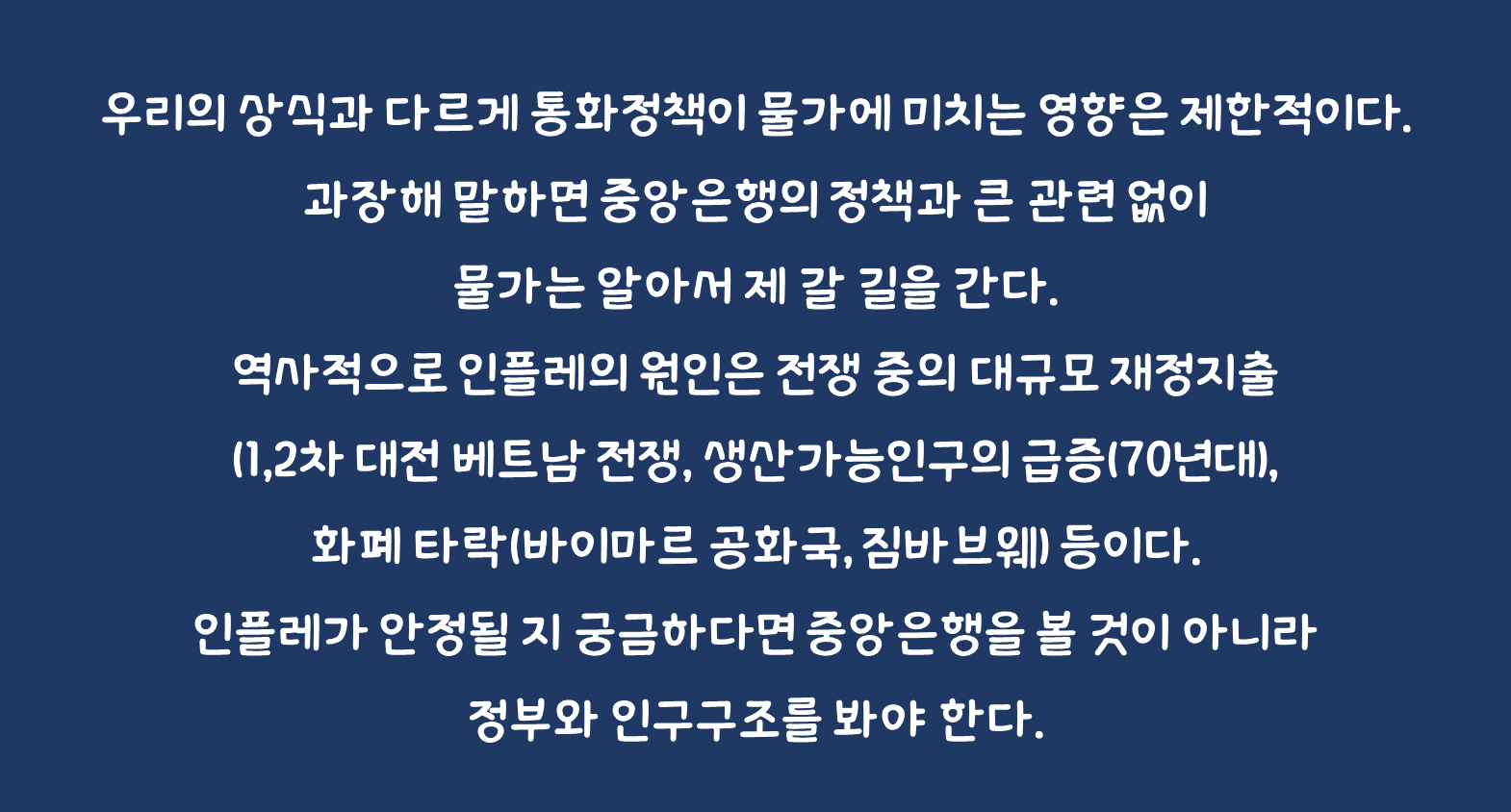 역사적으로 인플레의 원인은 전쟁 중의 대규모 재정지출(1,2차 대전 베트남 전쟁, 생산가능인구의 급증(70년대), 화폐 타락(바이마르 공화국, 짐바브웨) 등이다. 인플레가 안정될 지 궁금하다면 중앙은행을 볼 것이 아니라 정부와 인구구조를 봐야 한다. 이것이 재정 정책과 인플레가 관련성에 모두가 침묵함에도 불구하고 우리가 꾸준히 주장하는 것이다.