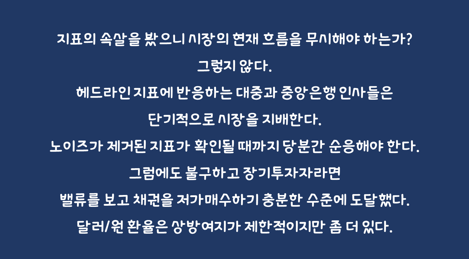 지표의 속살을 봤으니 시장의 현재 흐름을 무시해야 하는가? 그렇지 않다. 헤드라인 지표에 반응하는 대중과 중앙은행 인사들은 단기적으로 시장을 지배한다. 노이즈가 제거된 지표가 확인될 때까지 당분간 순응해야 한다. 강달러로 인해 환율 상승이 한은 통화 긴축재료라는 익숙한 이슈도 재부각될 수 있다. 그럼에도 불구하고 장기투자자라면 밸류를 보고 채권을 저가매수하기 충분한 수준에 도달했다. 달러/원 환율은 상방여지가 제한적이지만 좀 더 있다. 미국 지표 호조에는 강달러가 자연스럽고 부채한도 협상과 ECB의 덜 긴축적 피봇 불확실성 등을 좀 더 확인할 필요가 있다.